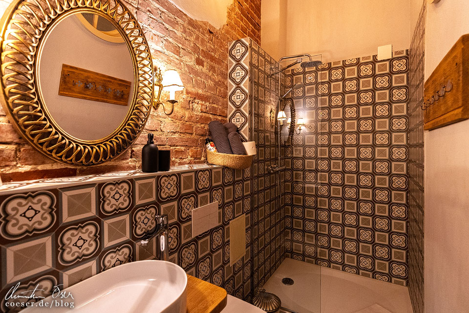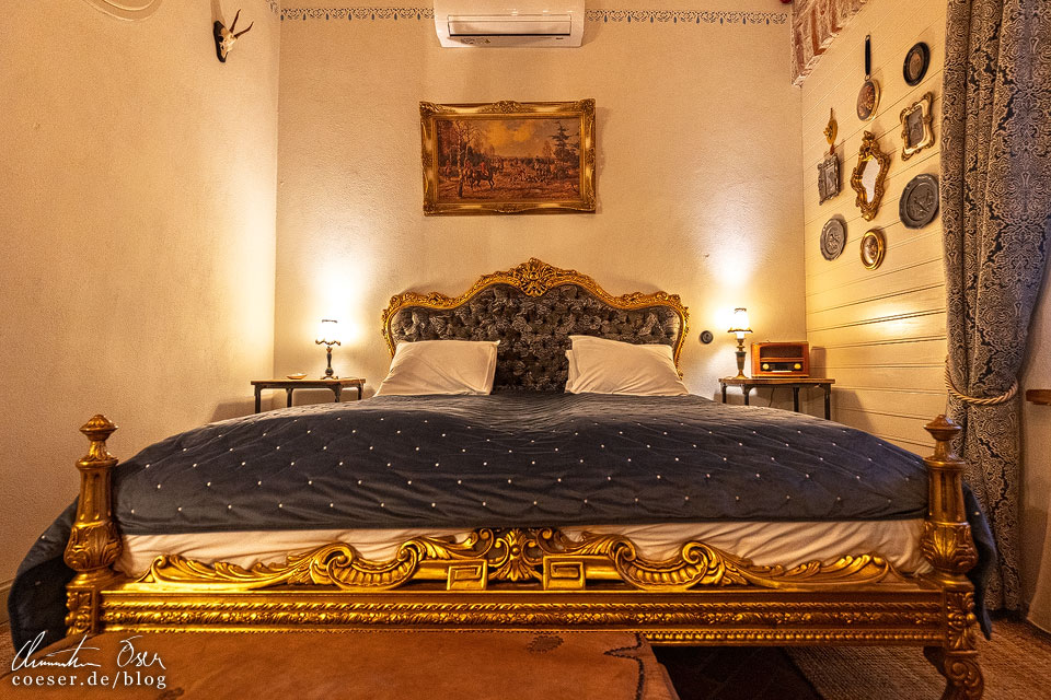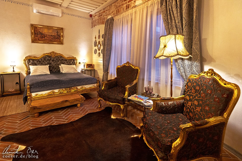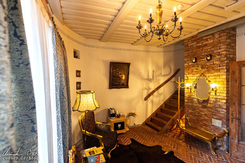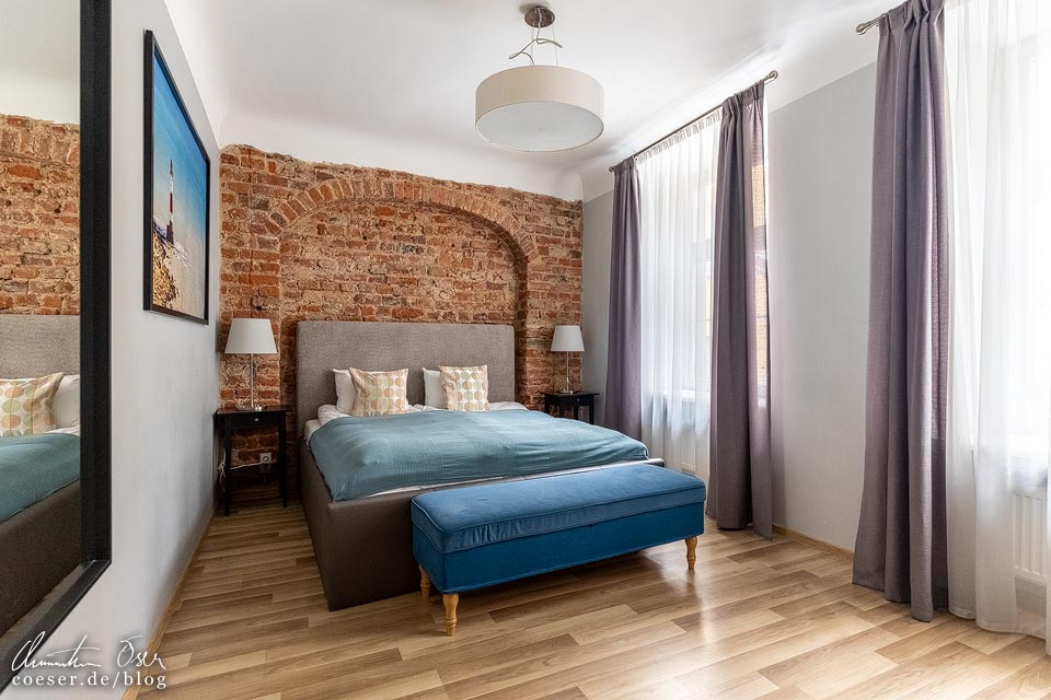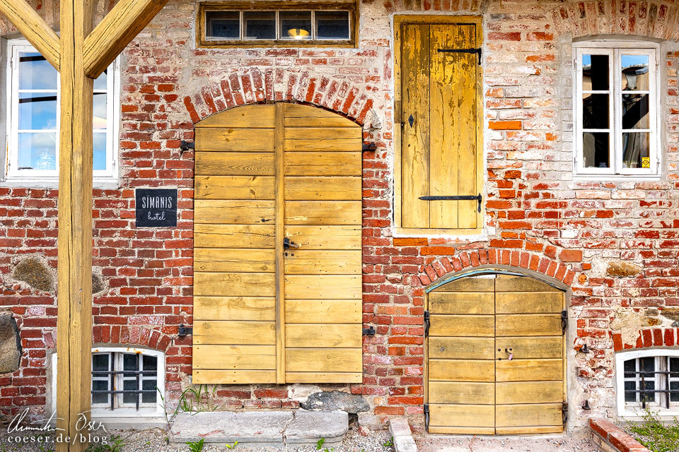 Von strahlendem Sonnenschein in Jürmala ging es am späten Nachmittag in Richtung Westen nach Kuldiga, wo uns schwere Tropfen aus den dunklen Regenwolken empfingen. Das tat unserer Laune aber keinen Abbruch, denn auf diese Stadt freuten wir uns schon sehr. Kuldiga ist eine der schönsten Destinationen in Lettland und wegen seiner perfekt erhaltenen Altstadt Teil des UNESCO-Weltkulturerbes. Bewegst du dich in den engen Gassen der Innenstadt, fühlst du dich zwischen all den morbid-charmanten Holzhäusern wie in die Vergangenheit zurückversetzt. Zu diesem Eindruck passte auch das großartig nostalgische Zimmer in unserer Unterkunft, denn das SĪMANIS Boutique Hotel* ist in einem restaurierten Haus aus dem 18. Jahrhundert beheimatet.