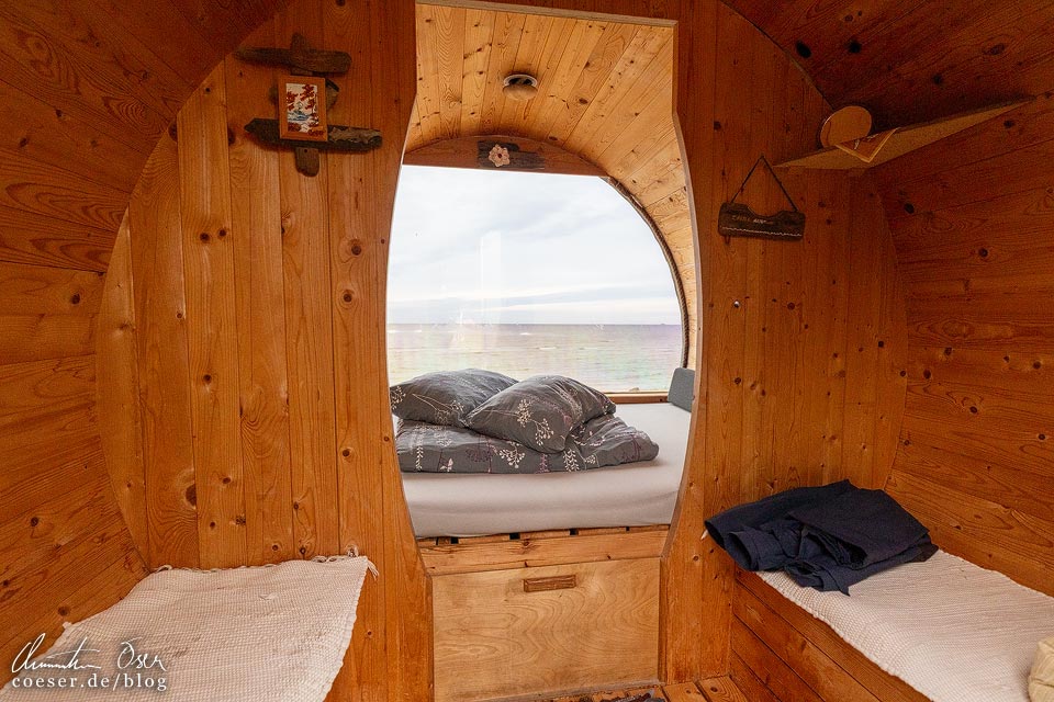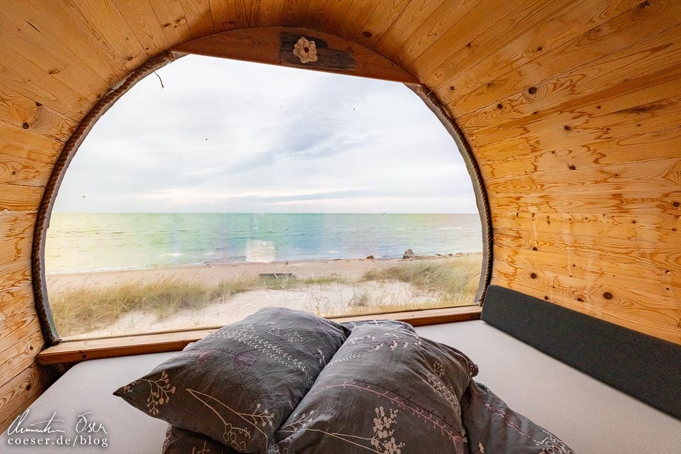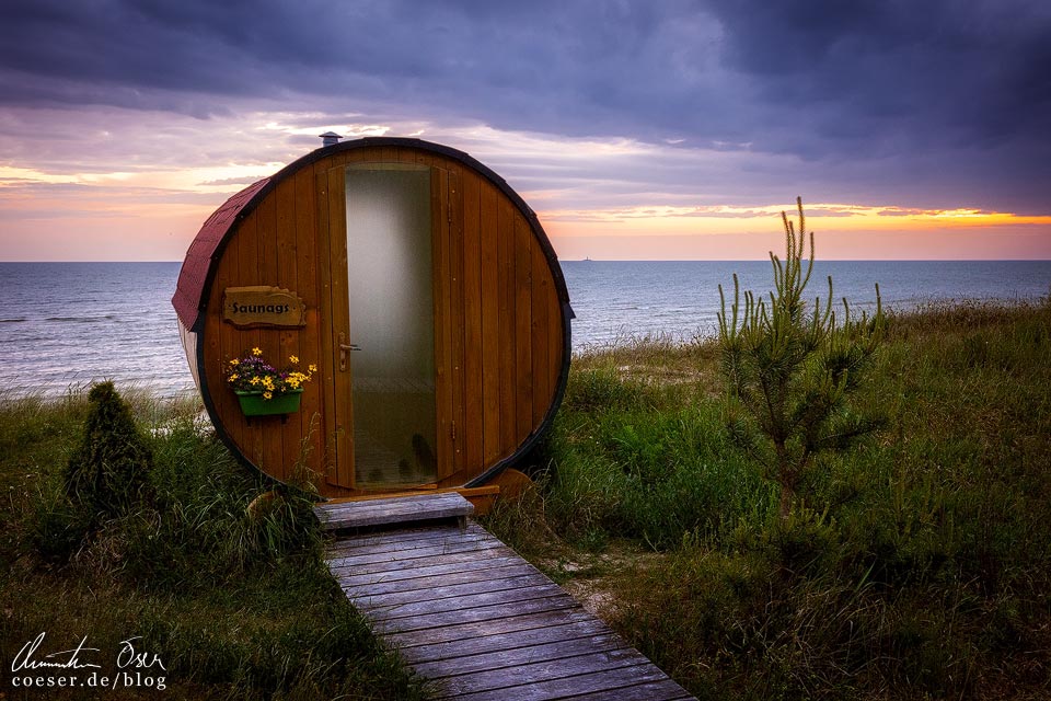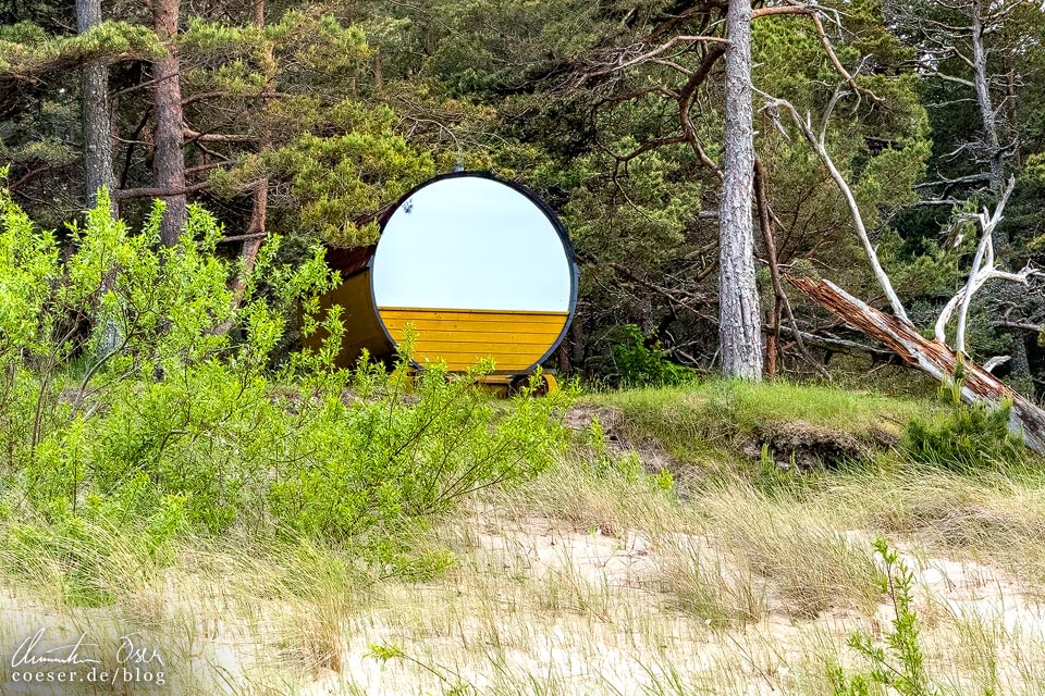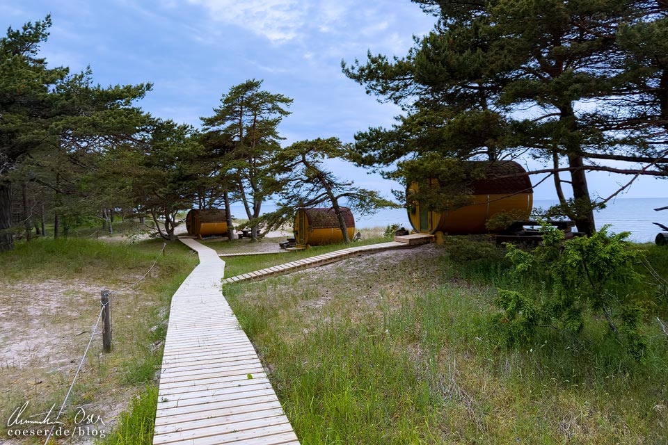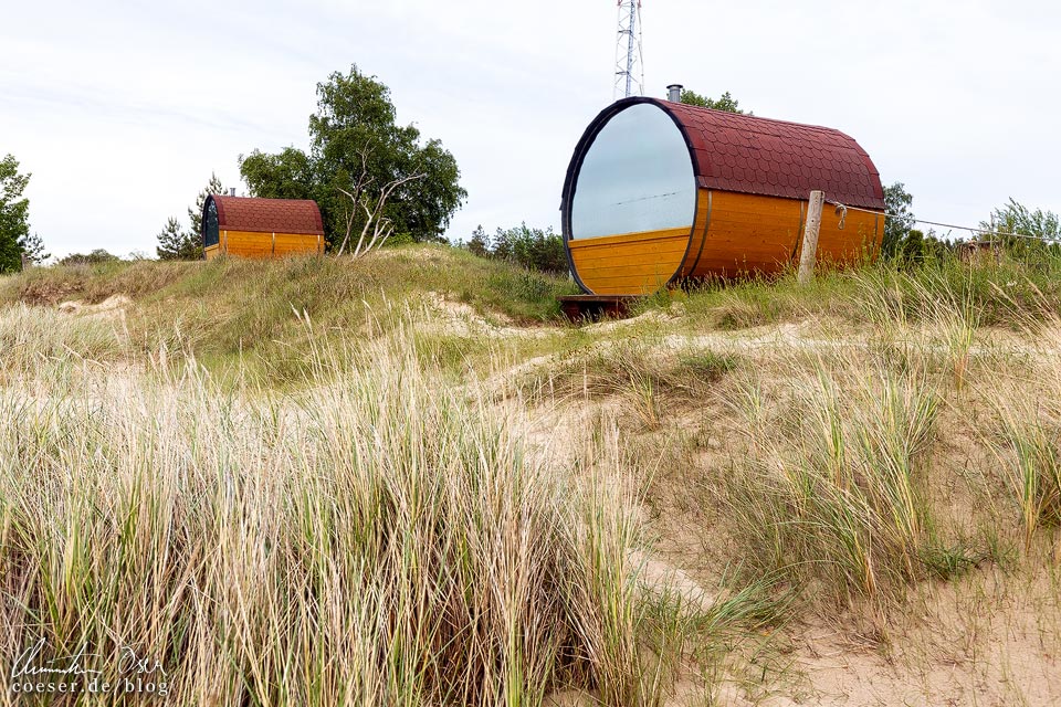 Schweren Herzens fuhren wir von Kuldiga los zum nördlichsten Punkt der Halbinsel Kurzeme. Doch auch Kap Kolka sollte uns unvergessliche Momente liefern. Mit den Holzfässern der Unterkunft Kempings Saulesmājas* hatten wir eine ganz spezielle Art der Unterbringung für eine Nacht gewählt. Direkt am Strand gelegen, blickst du hier durch ein großes Fenster hinaus aufs Meer und kannst aufgrund der besonderen Lage von Kap Kolka sowohl den Sonnenaufgang als auch den Sonnenuntergang vom selben Platz aus sehen – beides zelebrierten wir exakt an meinem Geburtstag ausgiebig. Durch die Übernachtung vor Ort konnten wir in der Früh ein Bad im kühlen Nass der Ostsee nehmen, nachdem wir zuvor die Sonne am Horizont beim Aufsteigen beobachteten.