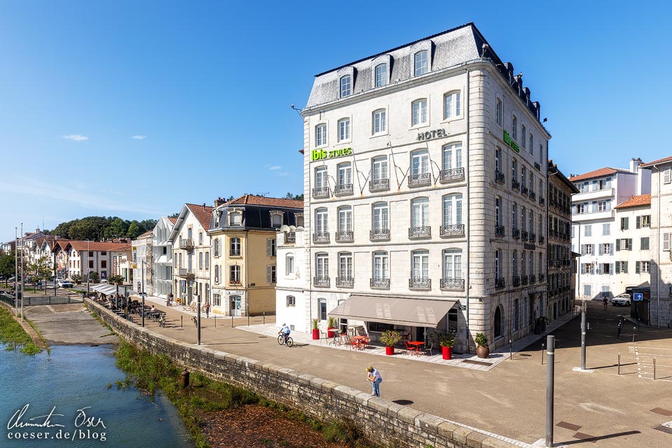Unterkunft: Hotel ibis Styles Bayonne Centre Gare* (1 Pl. de la République, Bayonne): Sehr gutes und preiswertes Hotel direkt am Ufer des Flusses Adour mit tollem Ausblick auf die Altstadt von Bayonne. Kurze Fußwege zum Bahnhof (zwei Minuten) und über die schöne Brücke in die Altstadt (fünf Minuten). Die Busstation nach Biarritz und andere Orte in der Region ist direkt vor dem Bahnhof. Zweckmäßig eingerichtete, saubere Zimmer, sehr bequemes Bett, Klimaanlage (abschaltbar), kleines Badezimmer mit super Dusche, schnelles WLAN. Frühstück ist im Preis inkludiert. Überschaubares Buffet, aber köstliche Auswahl an pikanten und süßen Speisen. Weiterempfehlung? JA!