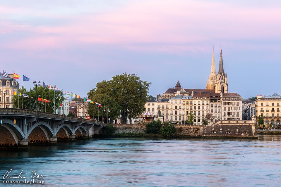 Schon lange nicht hatte ich derart Glück mit einem Hotelzimmer wie in Bayonne. Der große Fluss Adour trennt die Altstadt vom Stadtteil Saint-Esprit, wo der Bahnhof liegt und ich das Hotel ibis Styles Bayonne Centre Gare* direkt am Ufer buchte. So bot sich mir wohl einer der schönsten Ausblicke in Richtung Altstadt mit den Türmen der Kathedrale und der sehenswerten Brücke Pont Saint-Esprit. Abgesehen vom Hotel ist das Flanieren an der Uferpromenade prinzipiell sehr empfehlenswert – vor allem frühmorgens und abends zum Sonnenuntergang und danach, wenn das Licht die Umgebung in eine magisch wirkende Hülle packt. Auch der zweite Fluss, die Nive, ist für sehr gute Fotos der Skyline von Bayonne und der Häuserfronten in der Altstadt geeignet. Dieser Fluss ist deutlich kleiner und schlängelt sich zwischen „Grand Bayonne“ und „Petit Bayonne“ durch das Zentrum der Stadt.