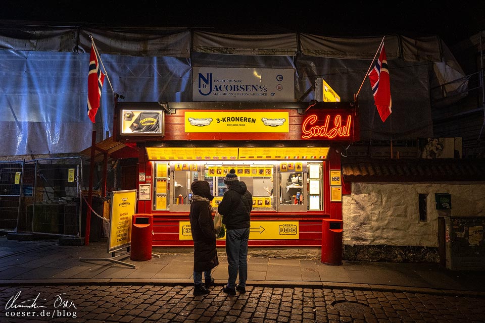 Würstelstand Trekroneren (Kong Oscars gate 1): Apropos Hotdog! In der Altstadt steht dieser berühmte Würstelstand mit einer großen Auswahl an norwegischen Würsten. Der Kiosk sieht schon optisch fantastisch aus, aber leider hatten wir beim Vorbeikommen keinen Hunger und beließen es bei einem Foto.