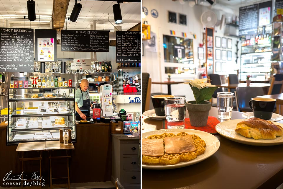 Café Skomakerstuen (Byfjellene 20): Machst du wie wir eine kleine Wanderrunde auf dem Hausberg Fløyen, kommst du am See Skomakerdiket vorbei. Dort lädt ein modernes Kaffeehaus zu einer Pause am Wasser ein. Meine Freundin verspeiste genüsslich ihre heiße Waffel mit Braunkäse und Marmelade, ich dagegen wählte hier einen typisch norwegischen Hotdog. Dieser wird ebenfalls in einer Waffel serviert und schmeckt wirklich exzellent!