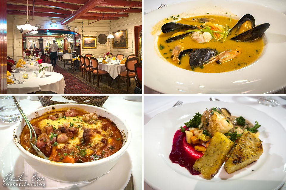 Restaurant Enhjørningen Fiskerestaurant (Enhjørningsgården 29): Wenn du dir etwas gönnen willst oder etwas zu feiern hast, dann bist du in diesem Restaurant richtig. Es liegt direkt in einem der historischen Holzhäuser im Hanseviertel Bryggen. Wir hatten Fischsuppe, Walcarpaccio, gratinierten Bacalao (Kabeljau) und ein Anglerfischfilet. Nach Möglichkeit unbedingt selbst testen! Abends und in der Hochsaison musst du hier rechtzeitig reservieren.