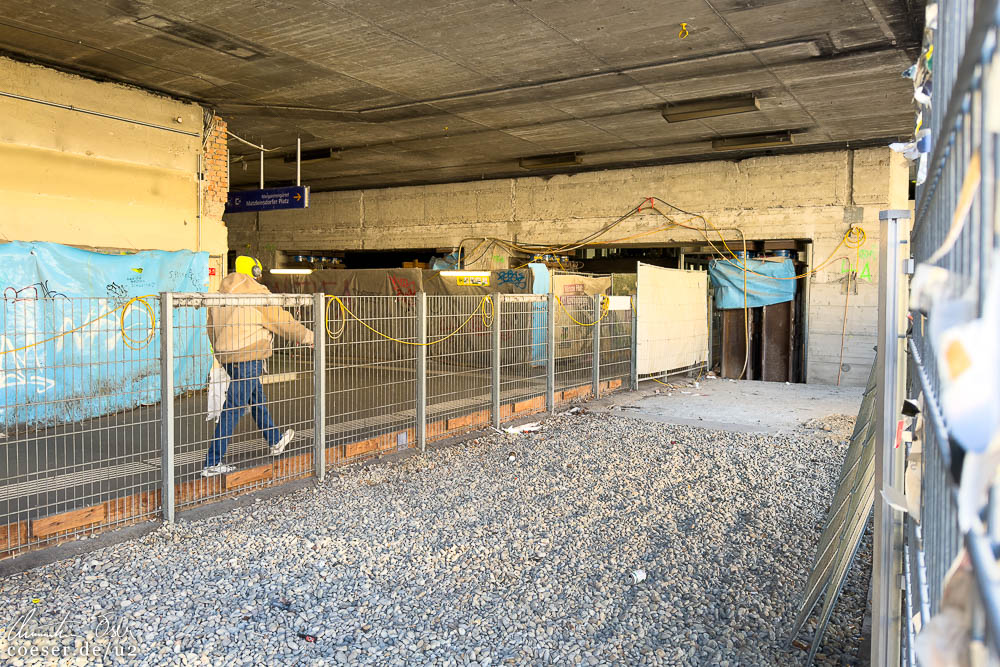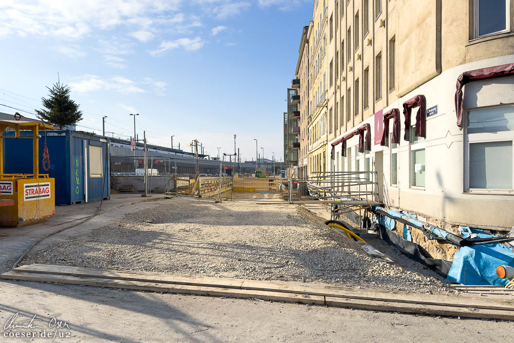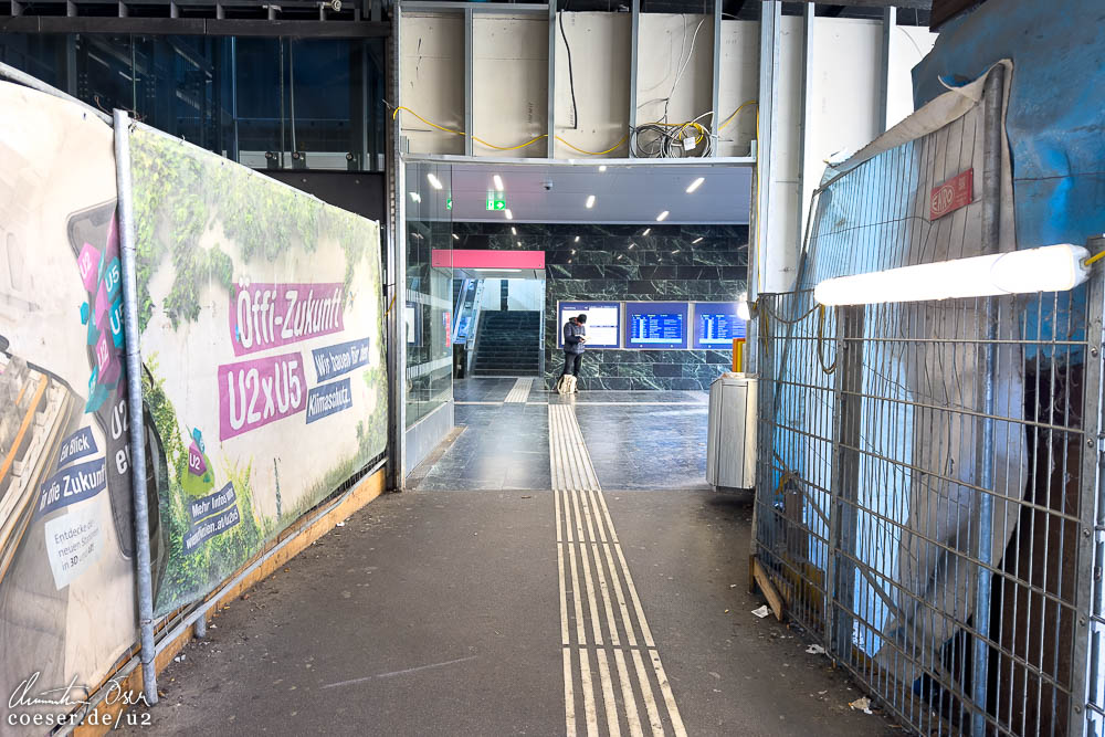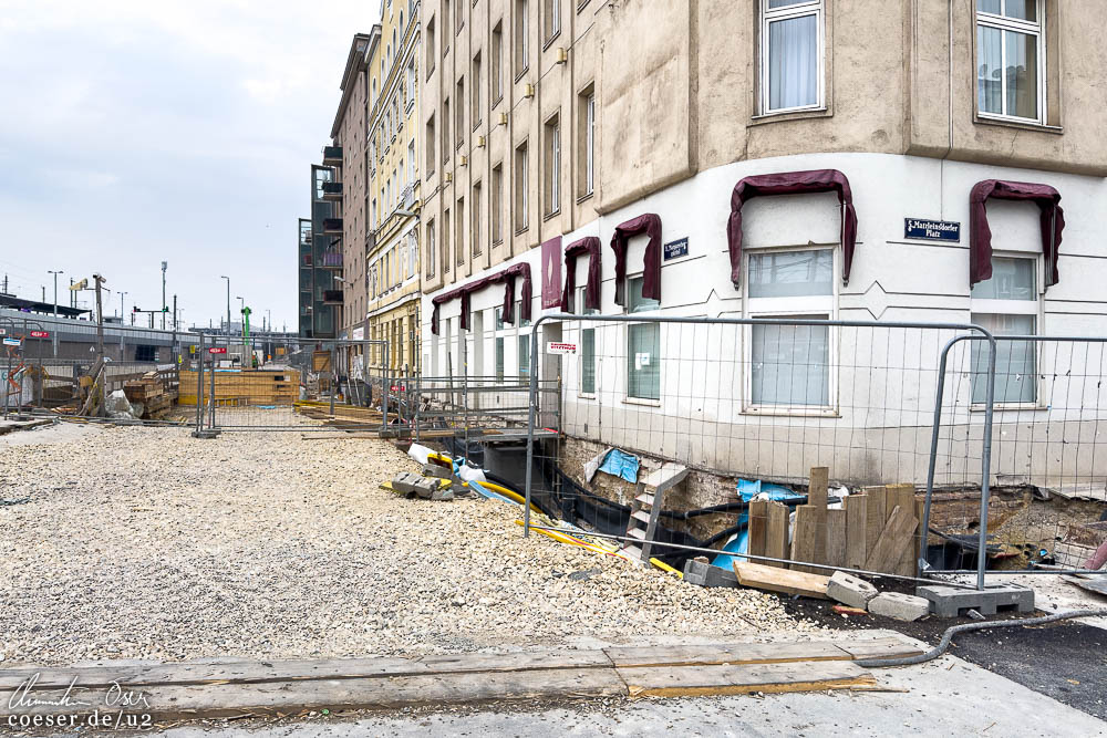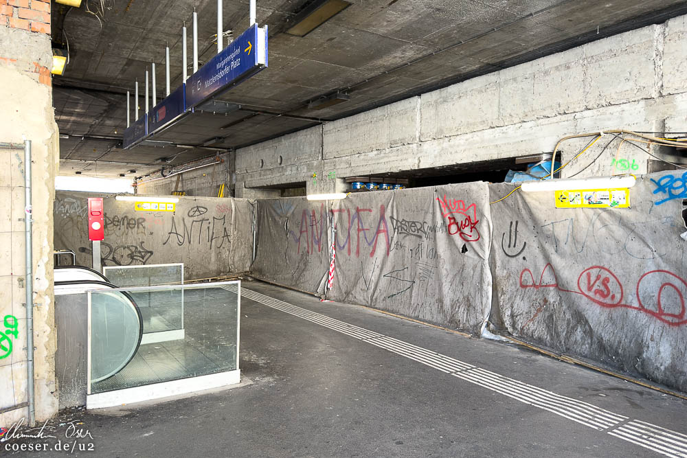 Lokalaugenschein in der S-Bahn-Station Matzleinsdorfer Platz einen Tag vor der einjährigen Sperre, während der unter anderem ein Verbindungsgang zur künftigen U2-Station errichtet wird; aktueller Blick auf den U2-Bauplatz Triester Straße.