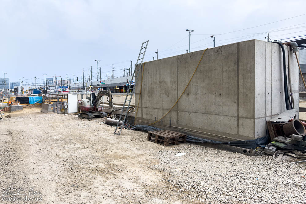 Baufortschritt an der Oberfläche der zukünftigen U2-Station Matzleinsdorfer Platz, Baustellenansicht in der Zwischenebene zur S-Bahn-Station.